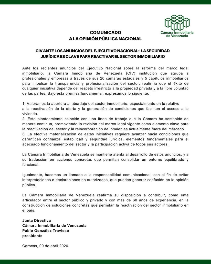 En un reciente pronunciamiento, la Cámara Inmobiliaria de Venezuela valoró la apertura al diálogo para reactivar el sector, pero enfatizó que la mater...